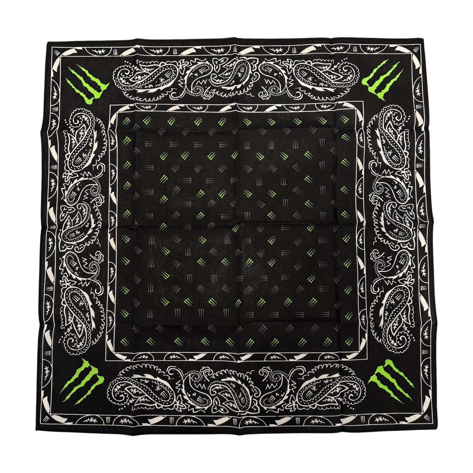 Monster Energy bandana with the signature brand logo. Sized at 21" x 21", this square bandana offers multiple styling options—wear it as a headband, neck accessory, or arm wrap. A practical addition to any wardrobe with recognizable Monster branding.